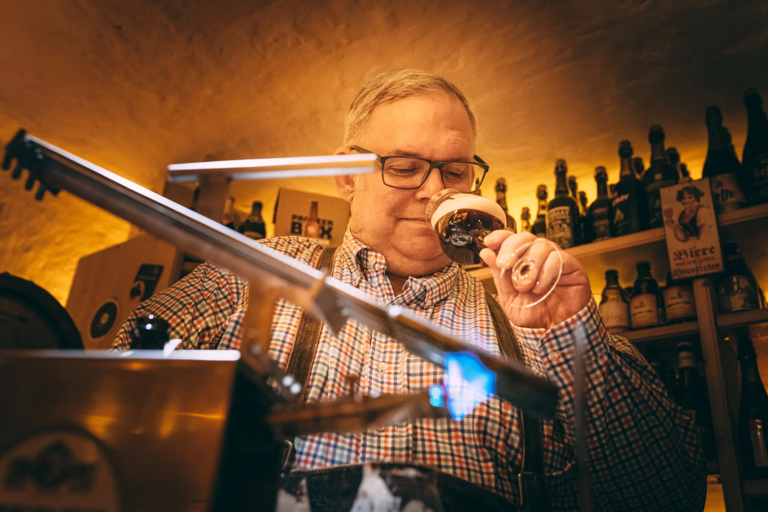 Karl Zuser prüft den Duft einer frisch eingeschenkten Bierspezialität im Biergasthof Riedberg.